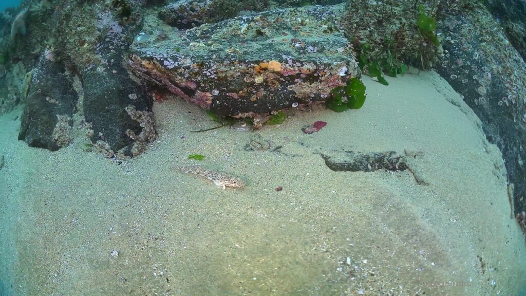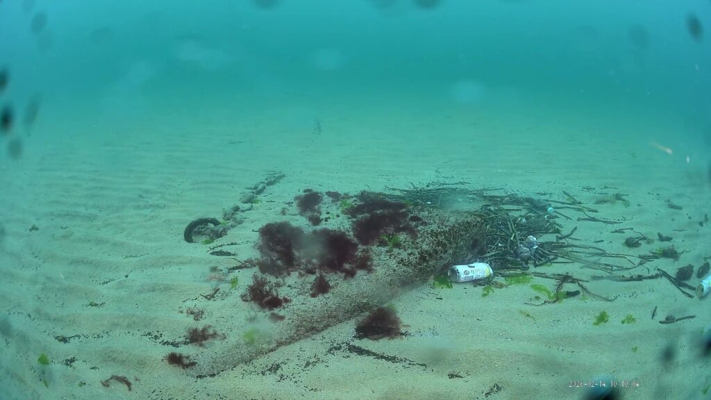 調査は、海岸の波打ち際から沖合約150m地点、および船で移動した約500m沖合地点を中心に、水中ドローンを用いて周辺100m圏内の海底状況を確認しました。